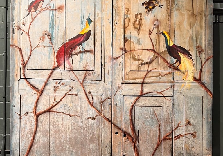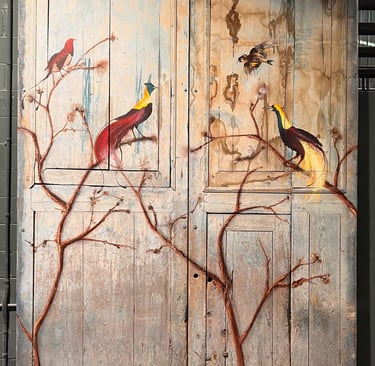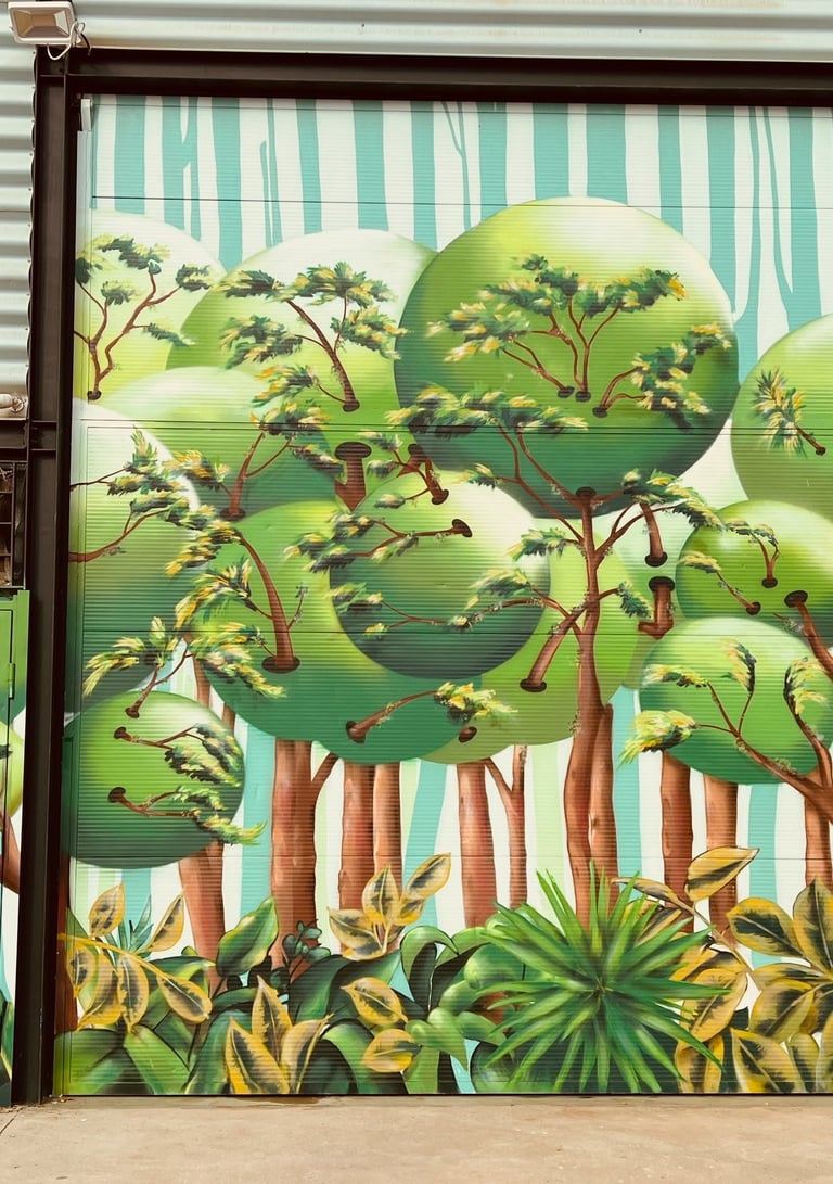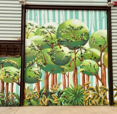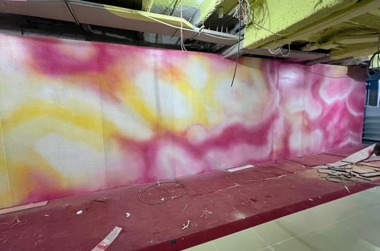 Mural sobre chapa perforada, aplicación de pintura acrílica al agua, y aplicación de barniz brillante con pistola.